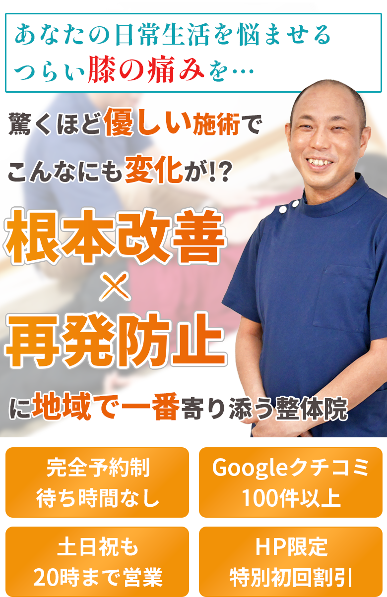 当院では、丁寧な問診と徹底した検査によって「膝の症状」の根本原因を明確にし、当院独自の「オーダーメイド施術」を用いて必要部位に対して筋肉の柔軟化などを適宜行い、あなたを苦しめる膝の症状を改善いたします。